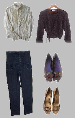 tem o Casaquinho transpassado que deixa o babado da camisa aparecer...